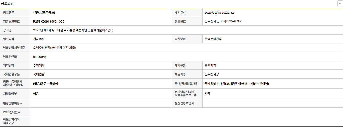 | 열람중 | 2025년 제3차 우리마을 주거환경 개선사업 건설폐기물처리용역 링크 있으면 표시 | 한국환경산업협회 | 2025-06-18 |