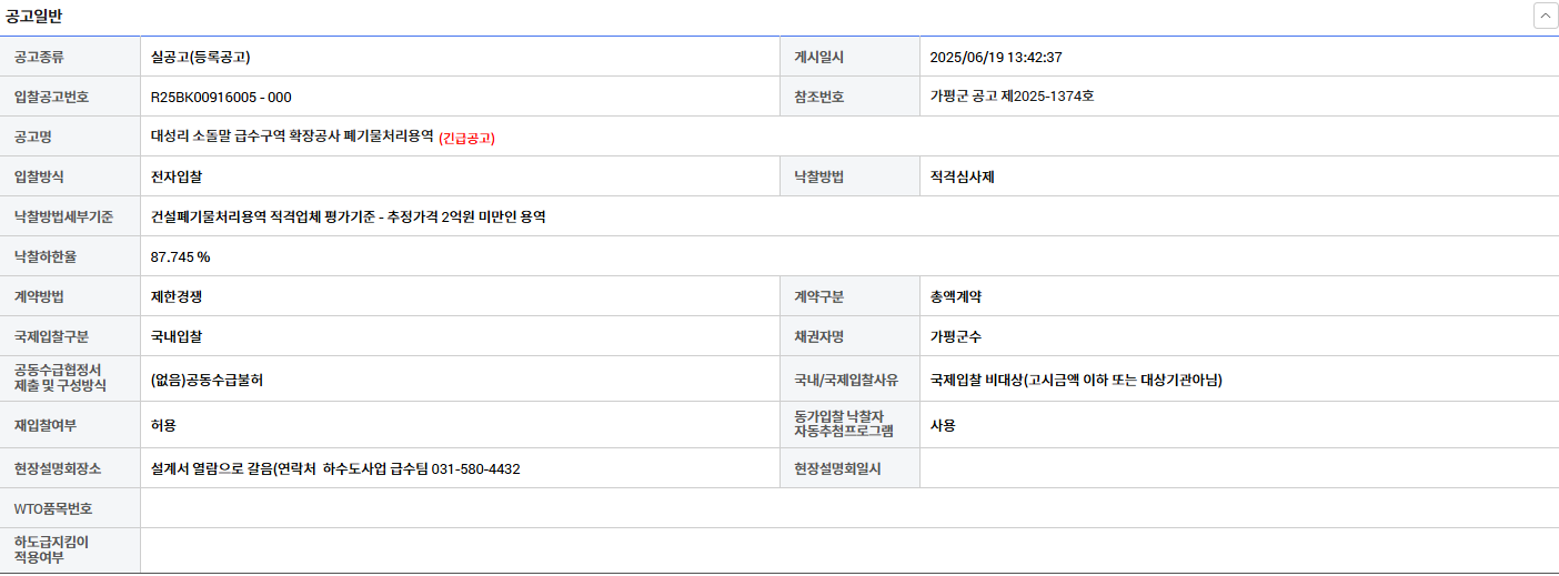 | 열람중 | 대성리 소돌말 급수구역 확장공사 폐기물처리용역 링크 있으면 표시 | 한국환경산업협회 | 2025-06-19 |