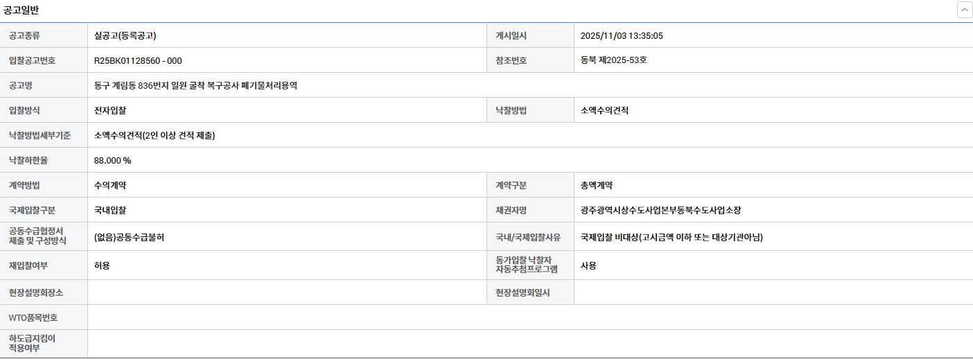 | 열람중 | 동구 계림동 836번지 일원 굴착 복구공사 폐기물처리용역 링크 있으면 표시 | 한국환경산업협회 | 2025-11-03 |