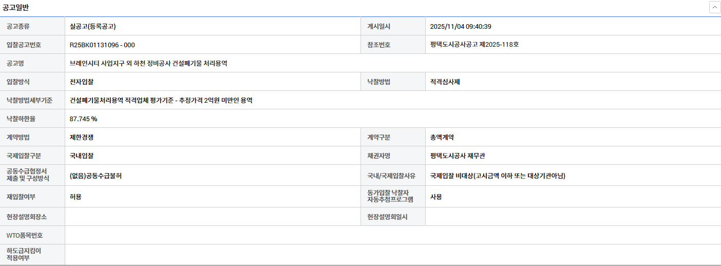 | 열람중 | 브레인시티 사업지구 외 하천 정비공사 건설폐기물 처리용역 링크 있으면 표시 | 한국환경산업협회 | 2025-11-04 |