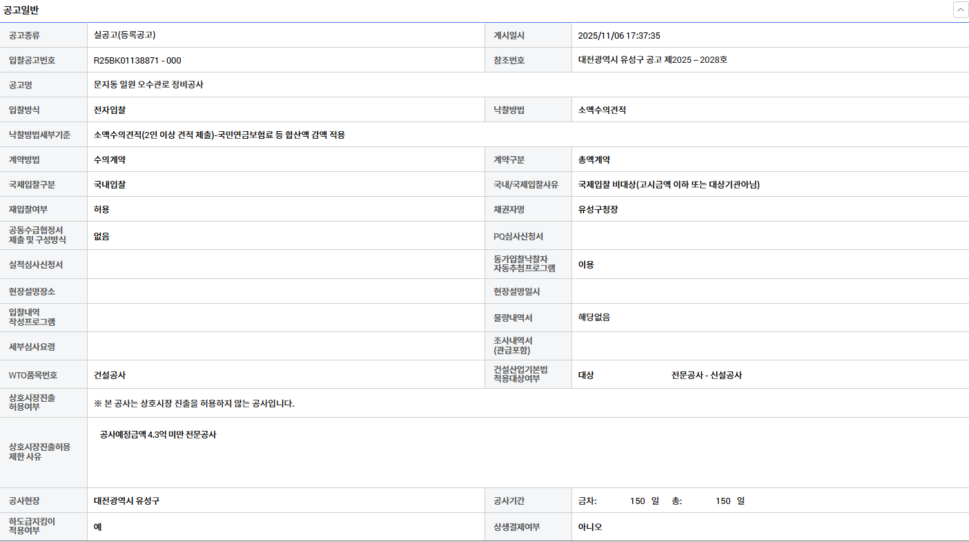 | 10641 | 2025년 하반기 중원구 하수도 준설공사(2차) 링크 있으면 표시 | 한국환경산업협회 | 2025-11-07 |