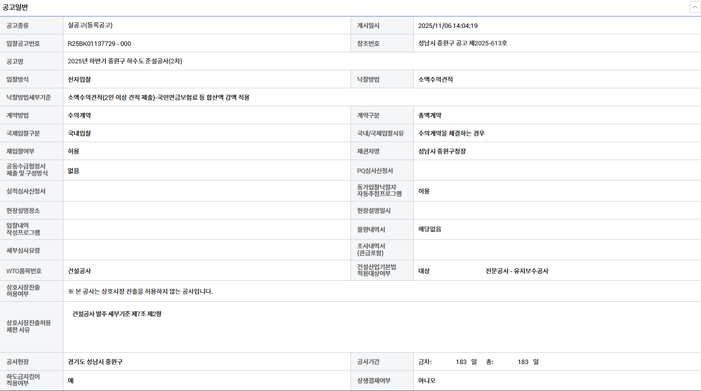 | 열람중 | 2025년 하반기 중원구 하수도 준설공사(2차) 링크 있으면 표시 | 한국환경산업협회 | 2025-11-07 |