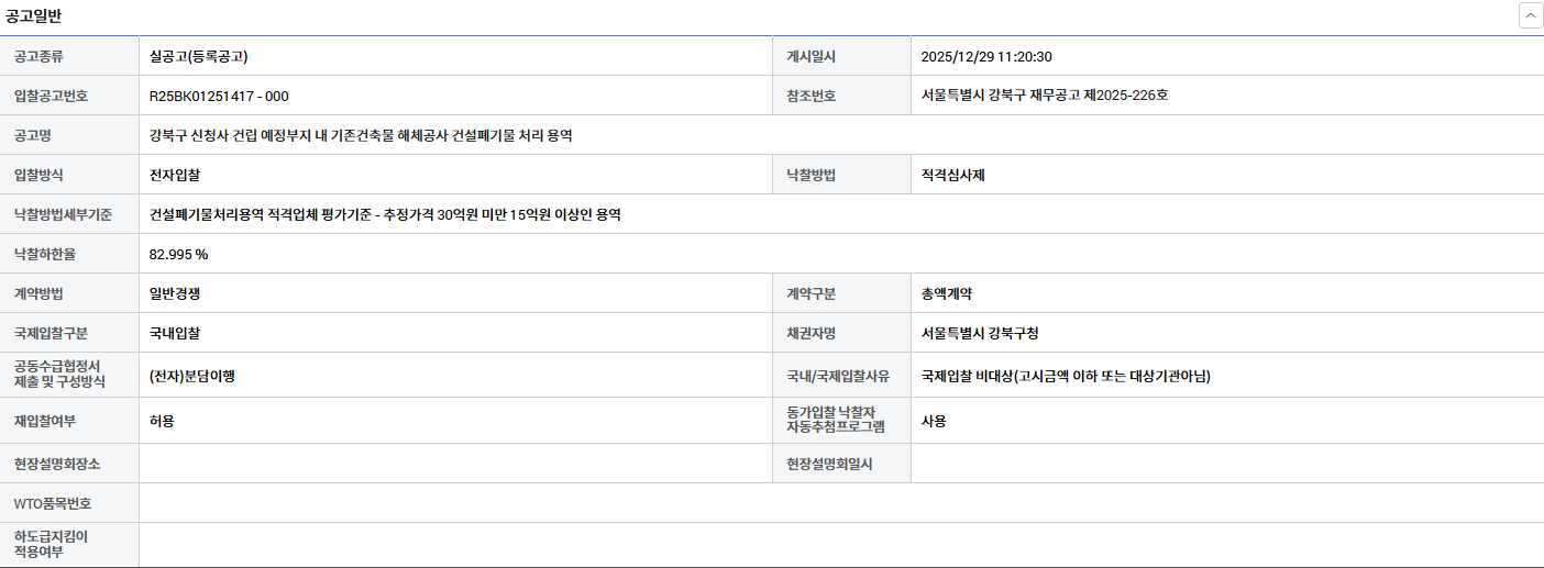 | 열람중 | 강북구 신청사 기존건축물 해체공사 건설폐기물 처리 용역 링크 있으면 표시 | 한국환경산업협회 | 2025-12-29 |