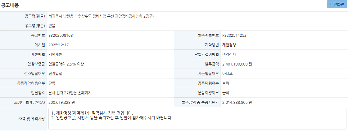 | 열람중 | 서귀포시 남원읍 노후상수도 정비사업 우선 관망정비공사(1차 2공구) 링크 있으면 표시 | 한국환경산업협회 | 2025-12-30 |