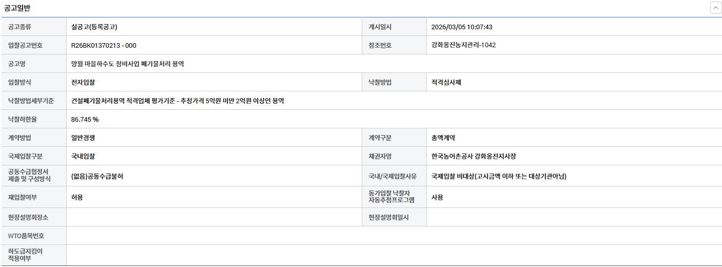 | 11012 | 경북 성주 신부리 공유재산 시설물 철거공사 건설폐기물처리용역 링크 있으면 표시 | 한국환경산업협회 | 2026-03-06 |