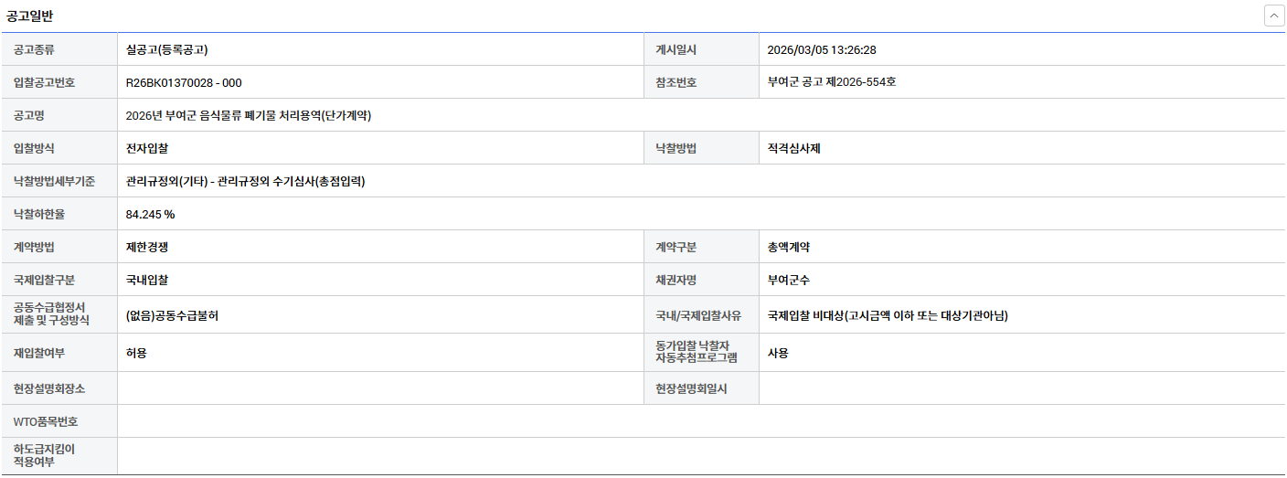 | 열람중 | 충남 부여군 음식물류 폐기물 처리용역(단가계약) 링크 있으면 표시 | 한국환경산업협회 | 2026-03-06 |