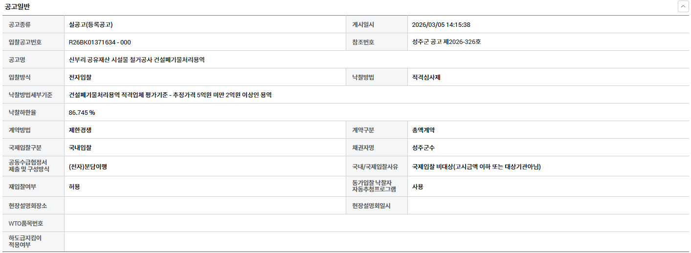 | 열람중 | 경북 성주 신부리 공유재산 시설물 철거공사 건설폐기물처리용역 링크 있으면 표시 | 한국환경산업협회 | 2026-03-06 |