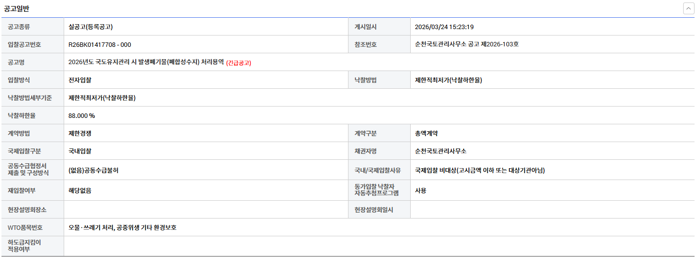 | 11082 | 대구 동부~용대간 도로건설공사 건설폐기물 처리용역 링크 있으면 표시 | 한국환경산업협회 | 2026-03-25 |