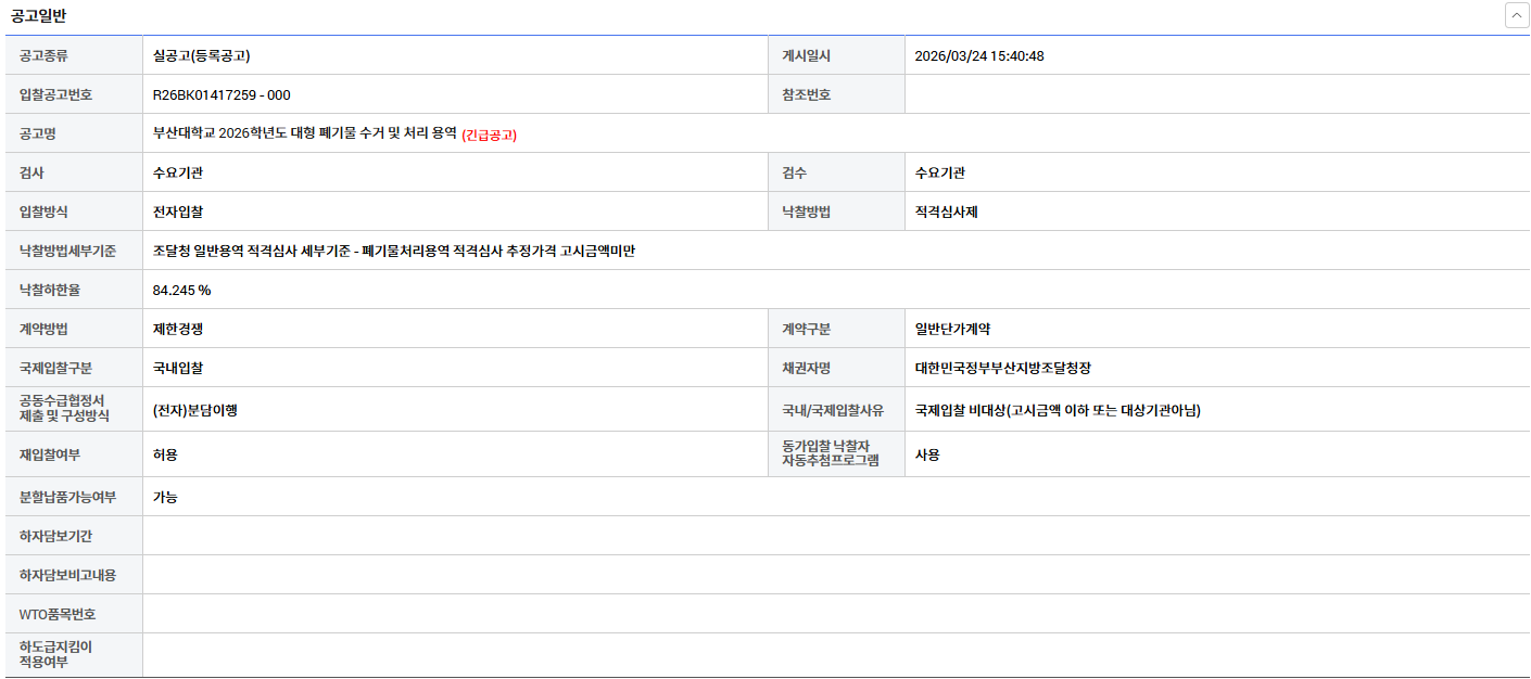 | 열람중 | 부산대학교 2026학년도 대형 폐기물 수거 및 처리 용역 링크 있으면 표시 | 한국환경산업협회 | 2026-03-25 |