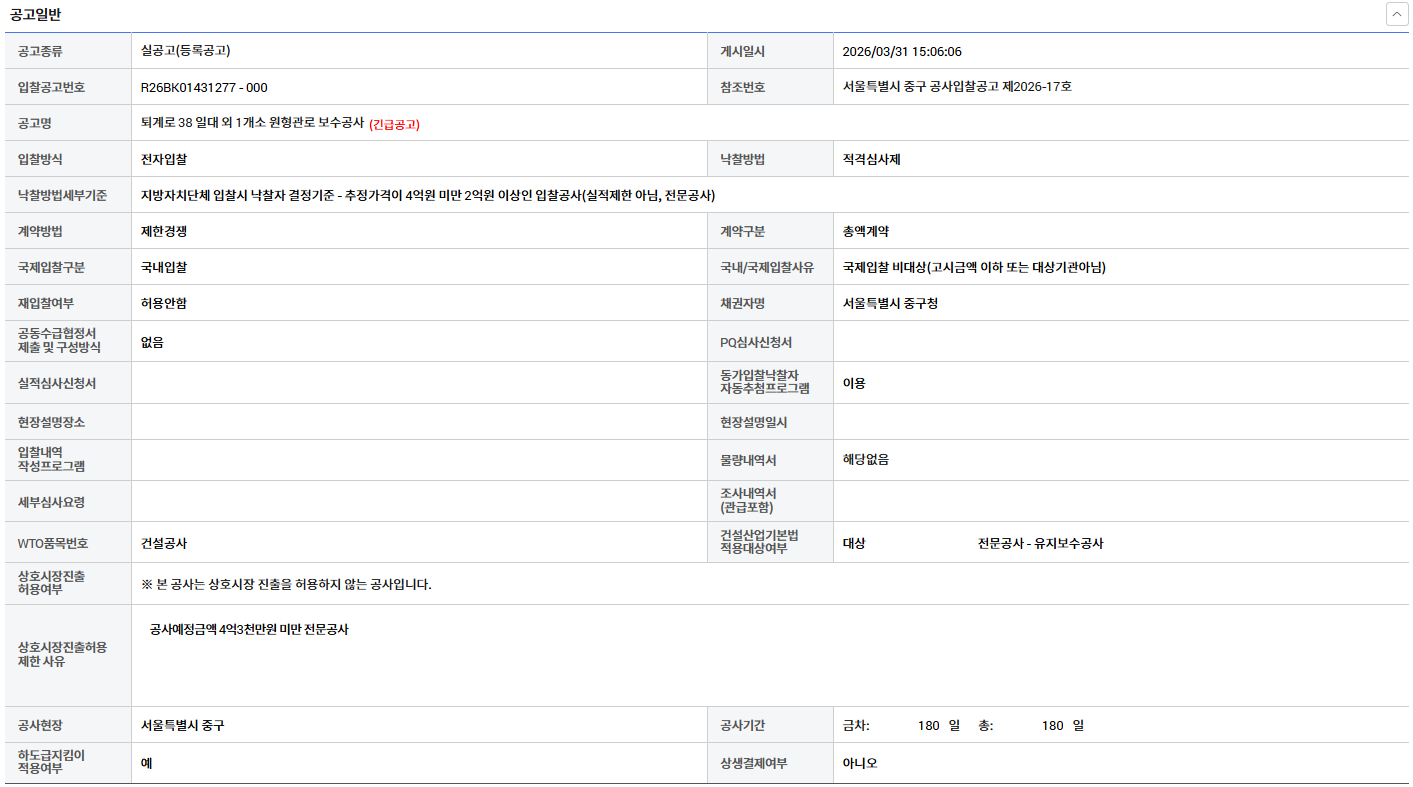 | 열람중 | 서울 퇴계로 38 일대 외 1개소 원형관로 보수공사 링크 있으면 표시 | 한국환경산업협회 | 2026-04-02 |