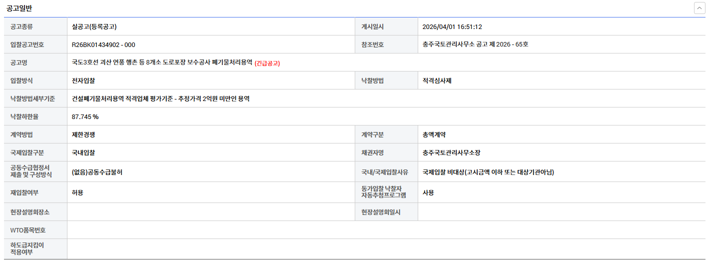 | 열람중 | 충북 국도3호선 괴산 등 8개소 도로포장 보수공사 폐기물처리용역 링크 있으면 표시 | 한국환경산업협회 | 2026-04-02 |