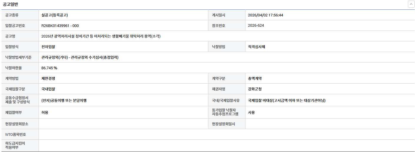 | 11105 | 부산 낙동강 하구쓰레기 정화사업 폐기물 처리용역 단가계약 링크 있으면 표시 | 한국환경산업협회 | 2026-04-02 |