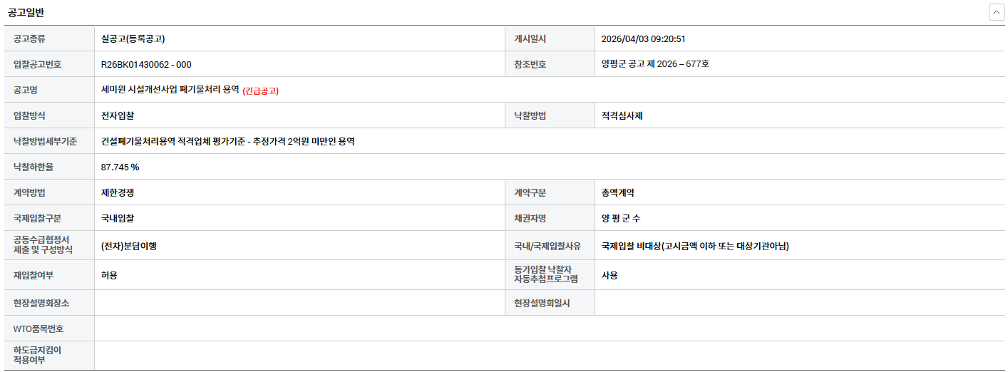 | 11112 | 경북 함창 하갈1리 취약지역 생활여건 개조사업 폐기물처리용역 링크 있으면 표시 | 한국환경산업협회 | 2026-04-03 |