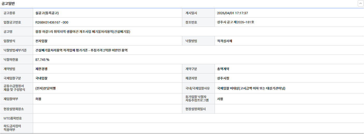 | 열람중 | 경북 함창 하갈1리 취약지역 생활여건 개조사업 폐기물처리용역 링크 있으면 표시 | 한국환경산업협회 | 2026-04-03 |