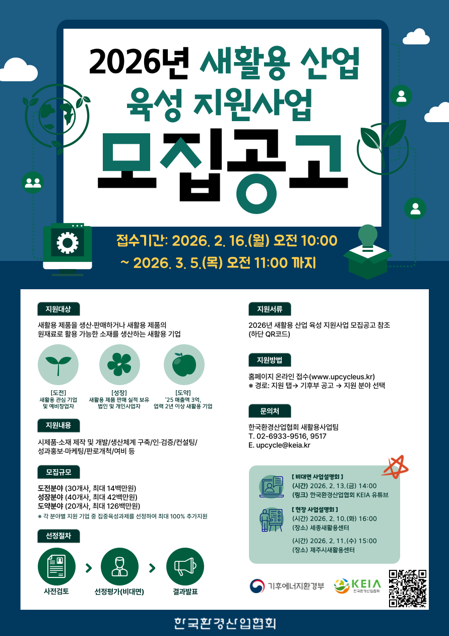 폐자원 활용 및 자원순환을 위하여 새활용 산업의 안정적인 정착과 발전을 지원하는 ‘2026년 새활용 산업 육성 지원사업’ 참가기업을 아래와 같이 모집하오니, 관심 있는 기업의 적극적인 참여를 바랍니다.