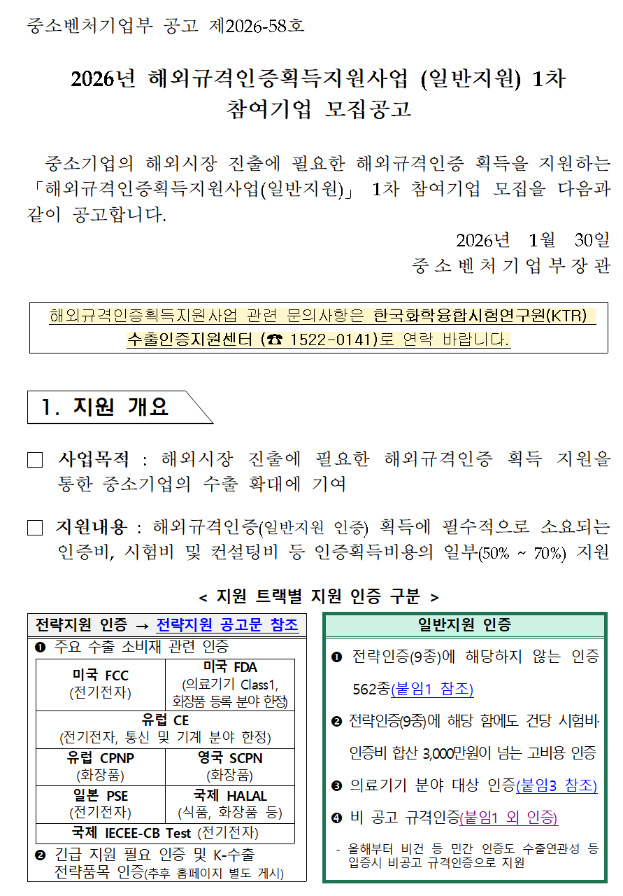 | 열람중 | [한국화학융합시험연구원] 2026년 해외규격인증획득지원사업(일반지원) 참여기업 모집공고 첨부파일 있으면 표시 링크 있으면 표시 | 한국환경산업협회 | 2026-02-13 |