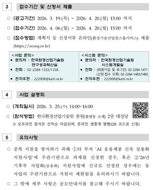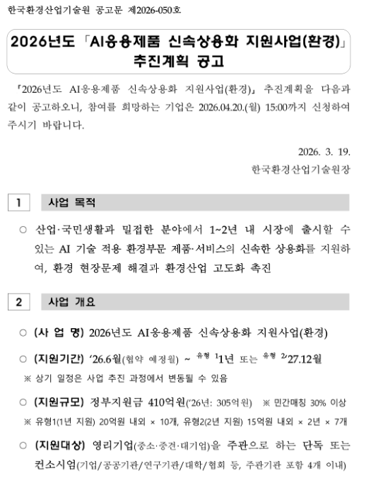 [한국환경산업기술원] 2026년도AI응용제품 신속상용화 지원사업(환경) 추진계획 공고