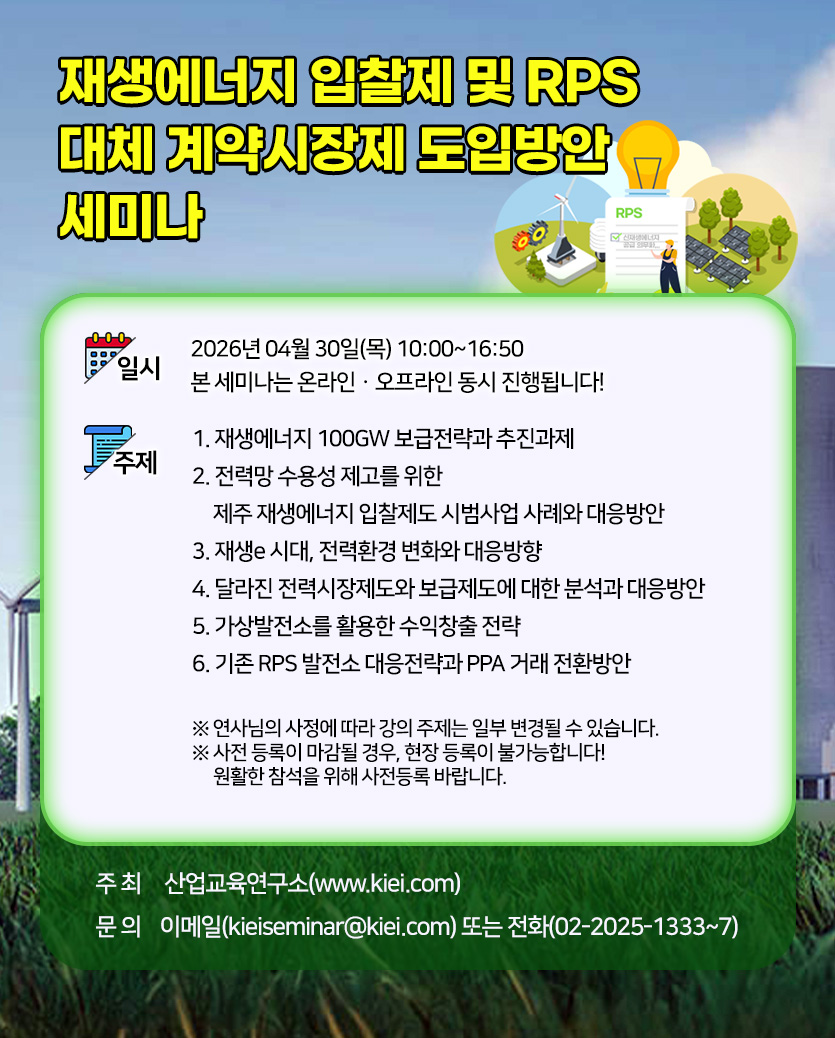 [kieibiz산업교육연구소] 재생에너지 입찰제 및 RPS 대체 계약시장제 도입방안 세미나 개최 안내
