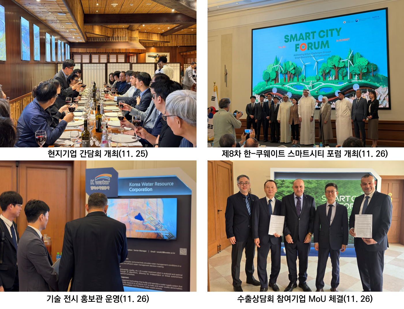 기후부는 주쿠웨이트대한민국대사관, 쿠웨이트 주거복지청과 공동으로 제8차 한-쿠웨이트 스마트시티포럼('25. 11. 26, Movenpick Hotel)을 개최하여 쿠웨이트의 스마트시티 및 녹색분야(수처리·폐기물 관리) 등에 대한 정책과 국내 우수 녹색 인프라 기술을 교류하여 현지 수요와 연계한 실질적인 협력 가능성을 확인하였다.