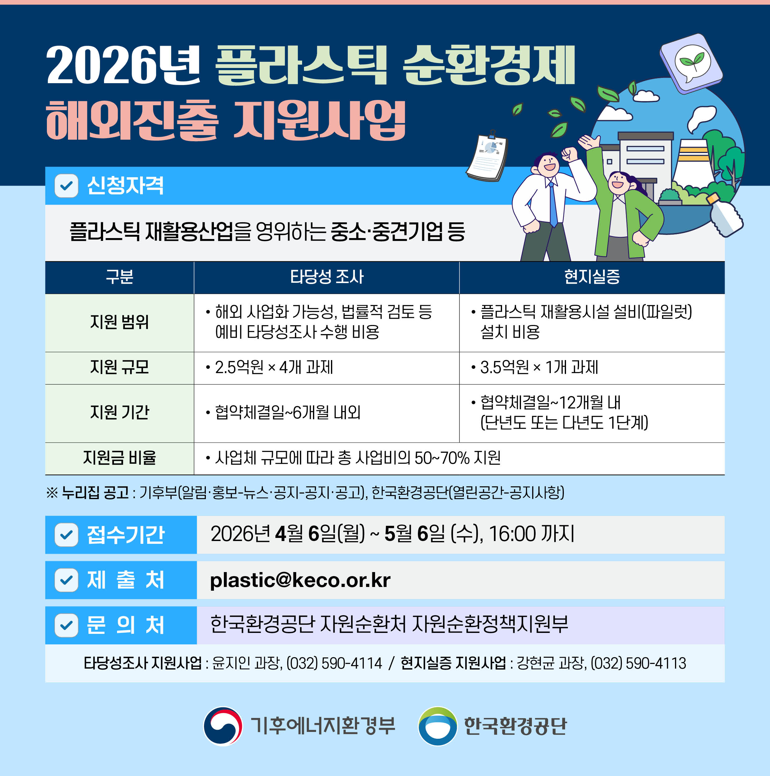 | 열람중 | [한국환경공단] 「플라스틱 순환경제 해외진출 지원사업」 참여기업 모집 안내 첨부파일 있으면 표시 링크 있으면 표시 | 한국환경산업협회 | 2026-04-14 |