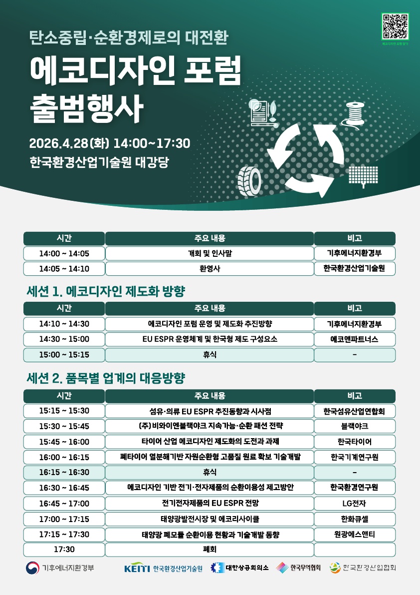 983 [한국환경산업기술원] 탄소중립·순환경제로의 대전환, 에코디자인 포럼 출범행사(Kick-off) 참가 신청 안내(4. 28.) 한국환경산업협회 2026-04-23